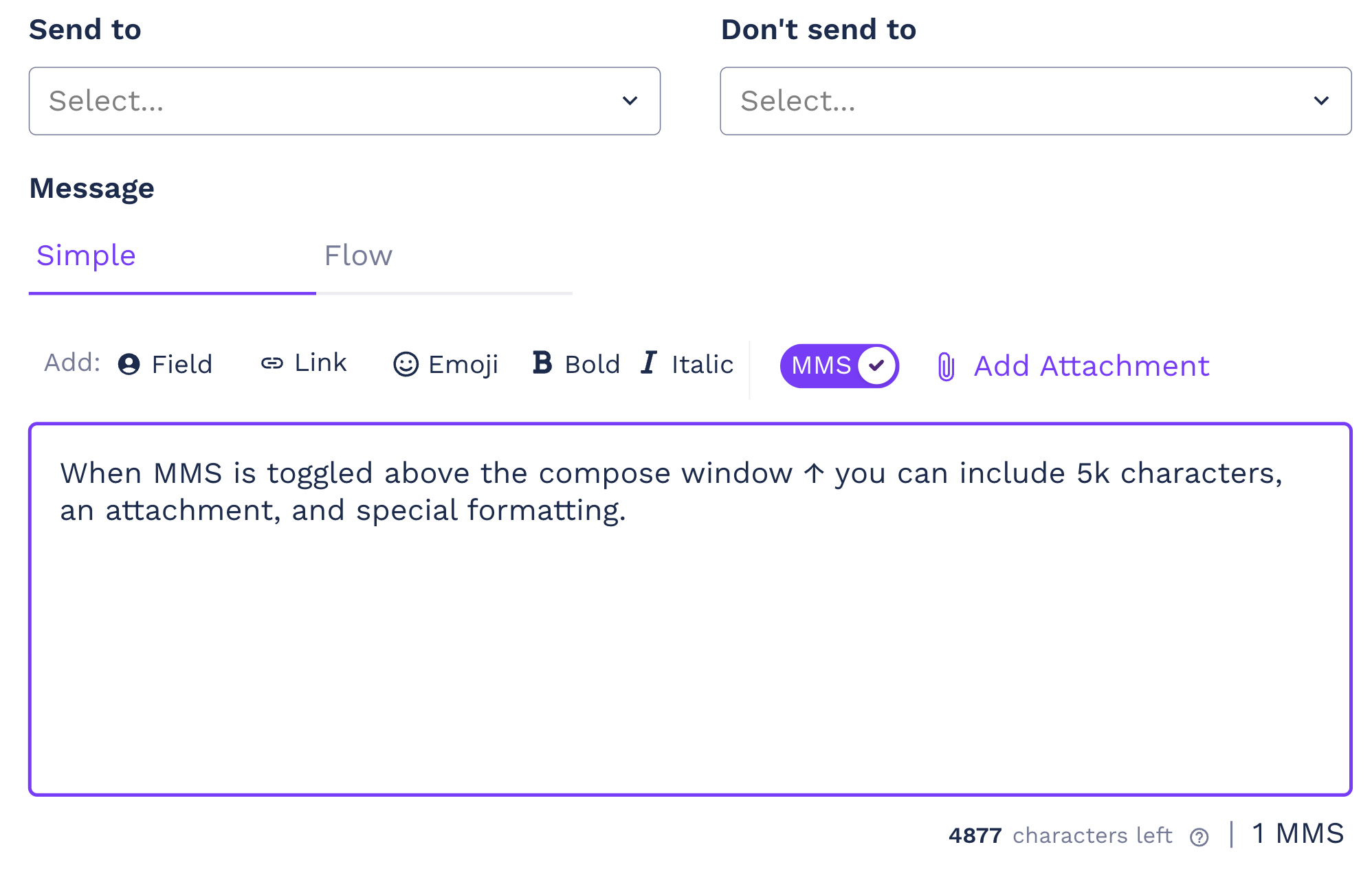 - To send an MMS, toggle the SMS button to MMS in the compose window of Broadcast and Flows pages