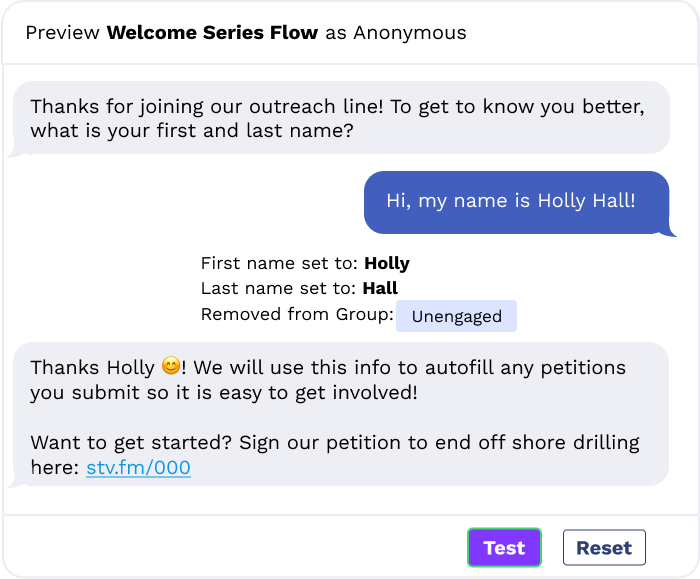 Now campaigns can collect and map a member’s first and last name in a single bot action. This powerful new feature uses AI and natural language processing to parse incoming responses and map it to the members’ first and last name field.