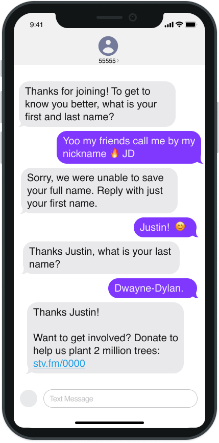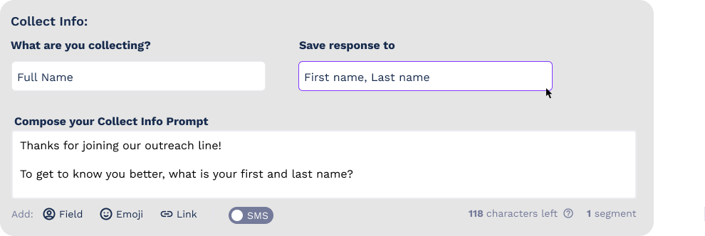 Set your collect info message to collect full name and map it to the first and last name fields. When drafting your collect info prompt, make sure you provide a description of what you’d like members to respond with. Example: Thanks for joining our campaign! To get to know you better, please reply with your first and last name.