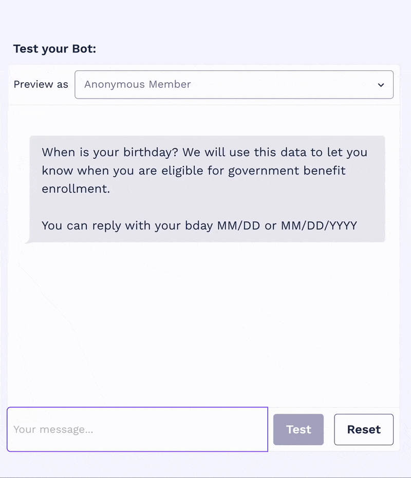 Campaigns can easily import or sync bday data from a CSV or their integrated CRM (such as EveryAction or ActionKit). Optionally, you can ask subscribers to share their bdays over text! Collect Info bot actions will parse for bday information or calculate birthday information using AI. Date inputs are recognized in any format, enabling automated data collection without requiring subscribers to follow a specific format. Ascend's artificial intelligence can recognize thousands of variations, including relative dates at the time of collection (i.e. my birthday was yesterday!). In the example below, we simulated this flow on Wednesday, July 16th. AI was able to determine yesterday was July 15th, and Friday is July 18th.